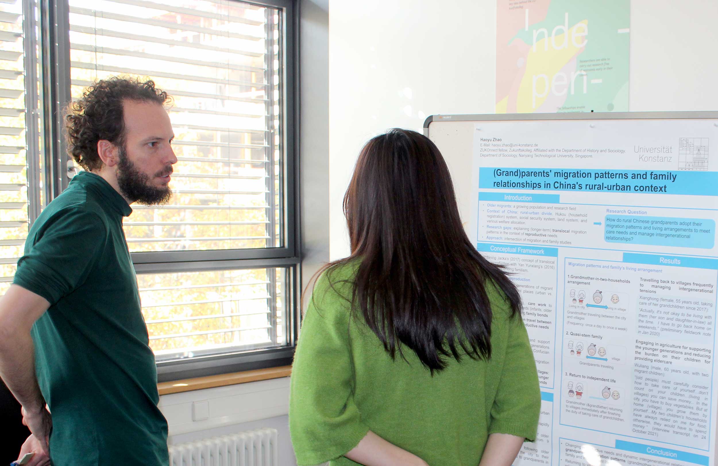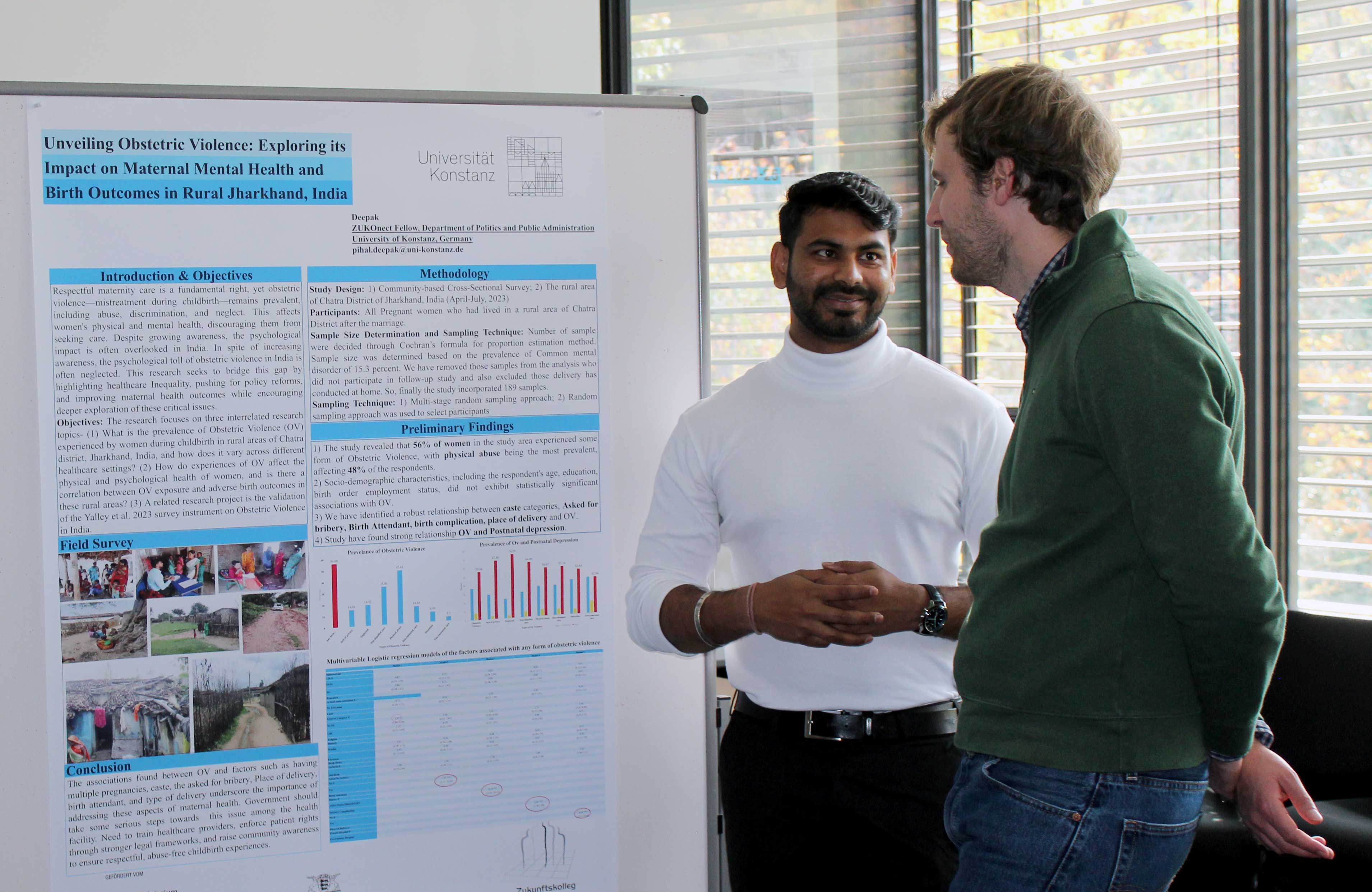 After a joint lunch, the poster session started with a short round of lightning talks, in which each of the ZUKOnnect Fellows spoke on their research topic for two minutes. Afterwards, the posters were presented to the audience.