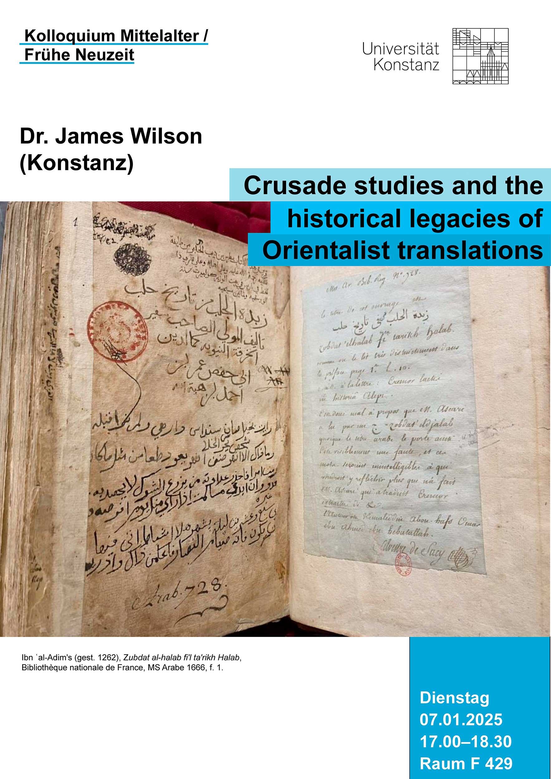 James Wilson gave a public talk entitled “Crusade studies and the historical legacies of Orientalist translations” in the framework of the colloquium “Mittelalter / Frühe Neuzeit” at the Department of History.
