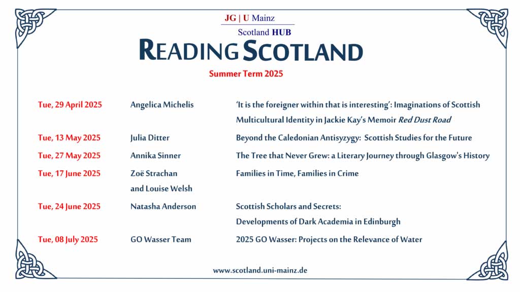 As part of the Reading Scotland Series at Johannes Gutenberg University Mainz, she presented her research on Scottish literature, which was funded by the Zukunftskolleg and the Centre for Cultural Inquiry (ZKF) at the University of Konstanz.